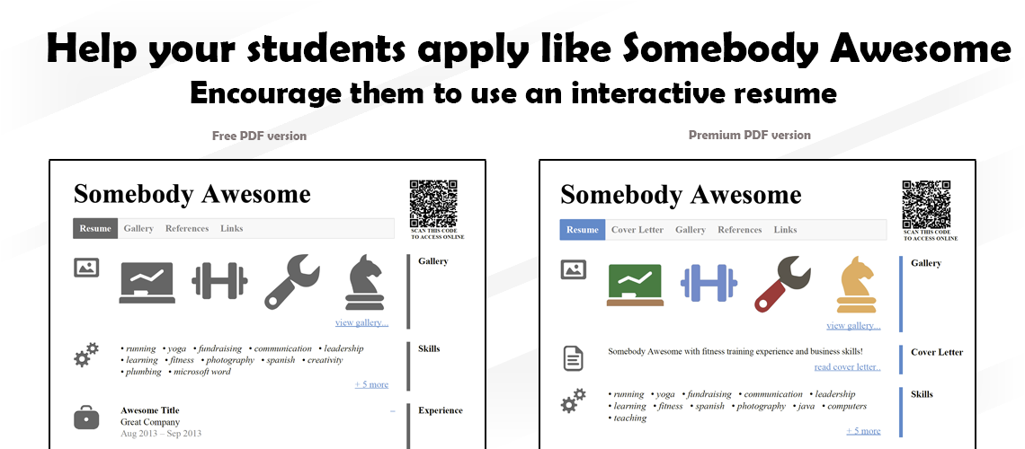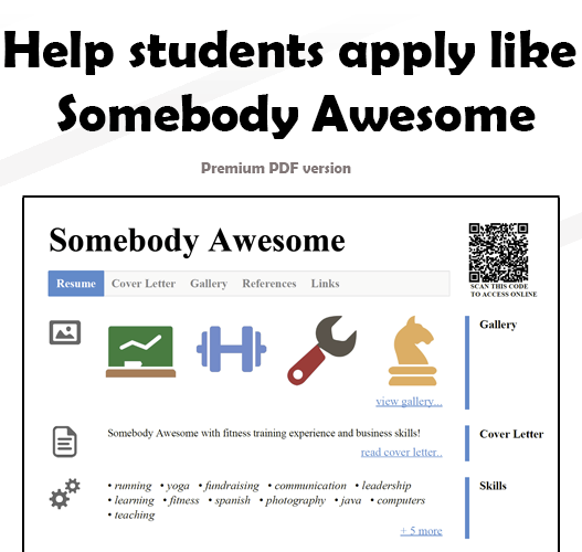 The PDF resume has a QR code in the top right that links to the online resume. This allows for additional information to be found online instead of cluttering the resume. It also demonstrates that your students embrace technology and are ready for today's workforce. QR codes are used everywhere from magazines to posters and now they can be on your students' resumes.